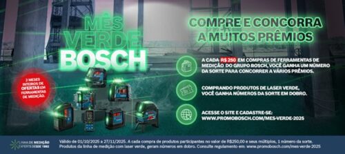 De 01/10/2025 a 27/11/2025, todo consumidor que comprar R$250 em ferramentas da Linha de Medição Bosch poderá cadastrar a nota fiscal no site oficial e ganhar um número da sorte para concorrer a prêmios imperdíveis.